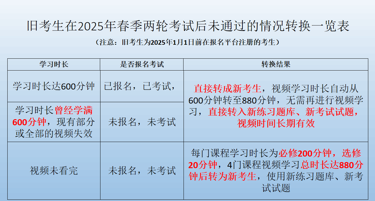 1.2025年1月1日前注册的考生若2025年春季两轮考试结束后仍未取得合格证书,将转入新的课程学习考试平台,启用新题库进行考试。