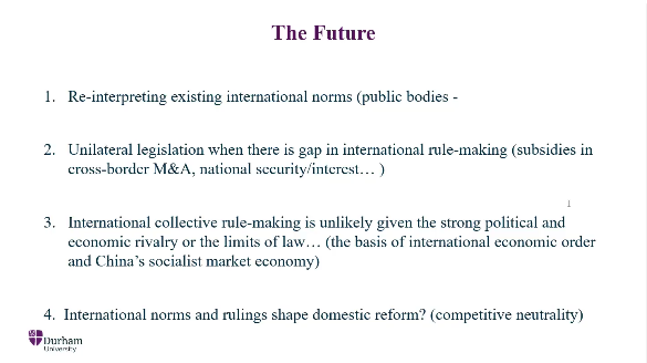 最后,杜教授对于在国际投资中的国有企业的未来进行了展望。首先,现行的关于公共机构的国际规范可能被重新解释。其次,尽管在强大的经济竞争还是法律限制背景下,国际集体规则制定尚无可能,但我国依然可以在国际规则制定中存在缺口时进行单边立法。最后,国际规范和裁决也将促进国内改革。