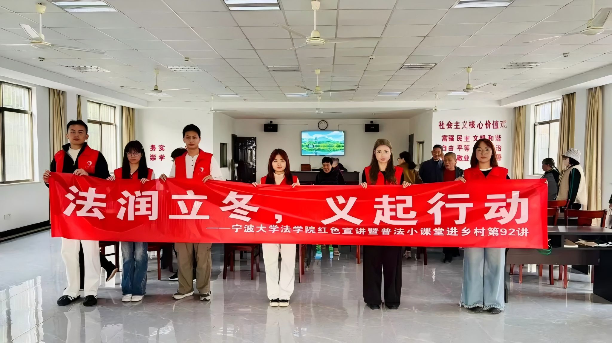 法律(非法学)硕士研究生第二党支部联合勤勇村党支部,开展“法润立冬,义起行动”红色宣讲。志愿者们走进勤勇村老年大学,与村里的老党员、长者们一同重温红色记忆,学习法律知识,在冬日里传递法治温度与人文关怀。本次活动暨普法小课堂进乡村第92讲。