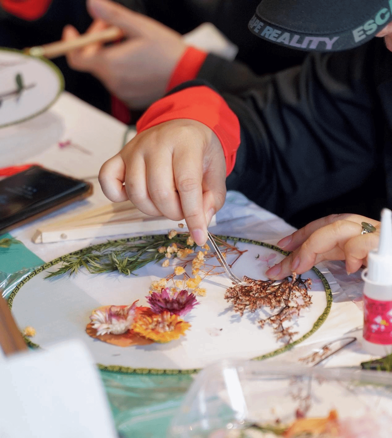 “纨扇如团月,出自机中素”,诗中描绘的团扇有着深厚的文化底蕴,它象征着团圆友善、吉祥如意的美好寓意。在老师的指导下,大家进行精心构思和设计,在扇面上进行绘画、贴花,用灵巧的双手和无限的创意将绢扇填满,制作出属于自己独一无二的团扇。