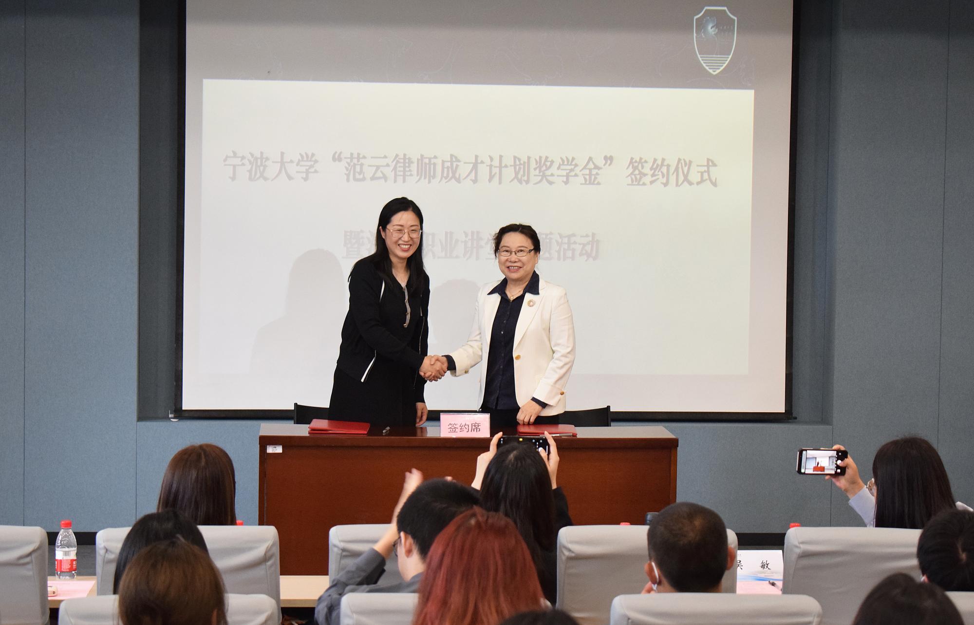 活动中,范云主任、孙芬娜老师分别在捐赠协议书上签字,并由孙芬娜老师向范云主任颁发捐赠证书,正式启动“范云律师成才计划奖学金”捐赠项目。