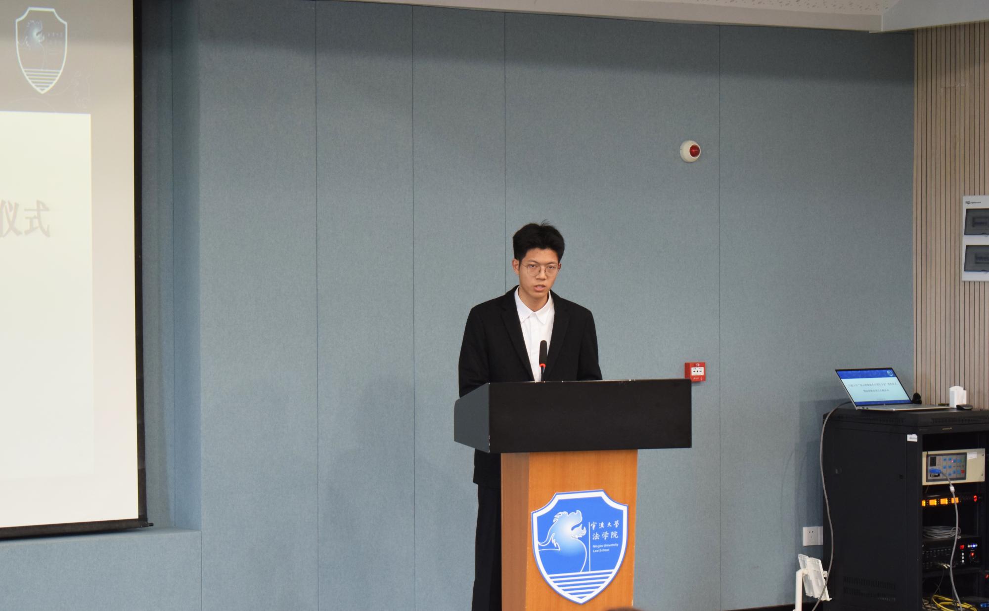 2021级法学专业本科生魏铭阳代表学生发言。他首先向范云主任表达真挚的谢意,并表示正因有了社会爱心人士的诚挚关怀和老师们的园丁匠心,大学生活才不再路途迷茫。他分享了自己参加模拟法庭的经历,以奋斗描绘出最美的青春画卷。台上的掷地有声是他的承诺,他表示,将珍惜前辈的关怀,努力学习专业知识并投身实践,不断朝着心之所向奋勇前进,仰望星空的同时脚踏实地,践行青年法学生和法律人的责任使命,为法治建设发挥自己的作用。