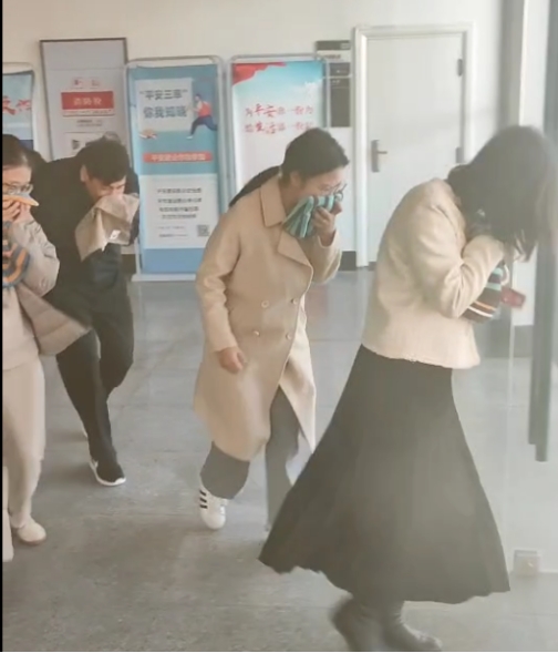 1楼廊道浓烟滚滚,党政办负责人迅速查看、快速定位,随后立即上报、开启应急广播、启动应急疏散预案,按照“安全第一、就近逃生”的疏散原则,引导楼内师生沿应急疏散安全路线快速撤离,等待救援力量赶往现场。