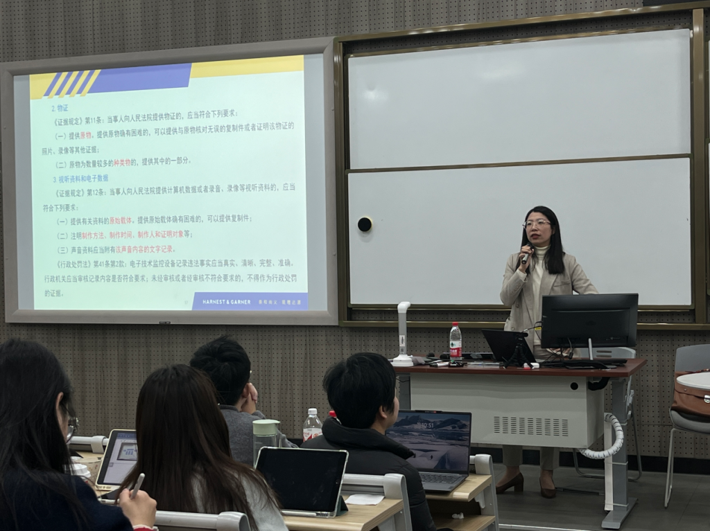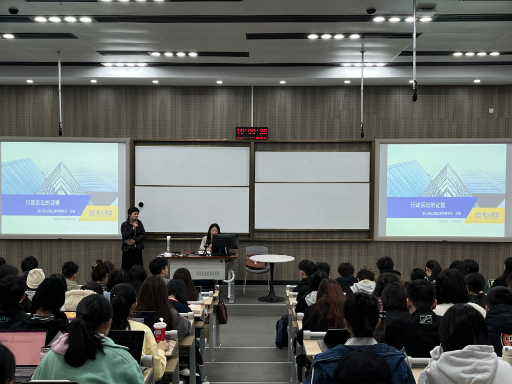 的研究生和本科生带来了一场“行政诉讼的证据”有关内容的实务课程,主要结合其实务中的办案经历,从行政诉讼的事实问题与证据、证据效力、举证责任、证明责任四个方面进行了分享,全场座无虚席。