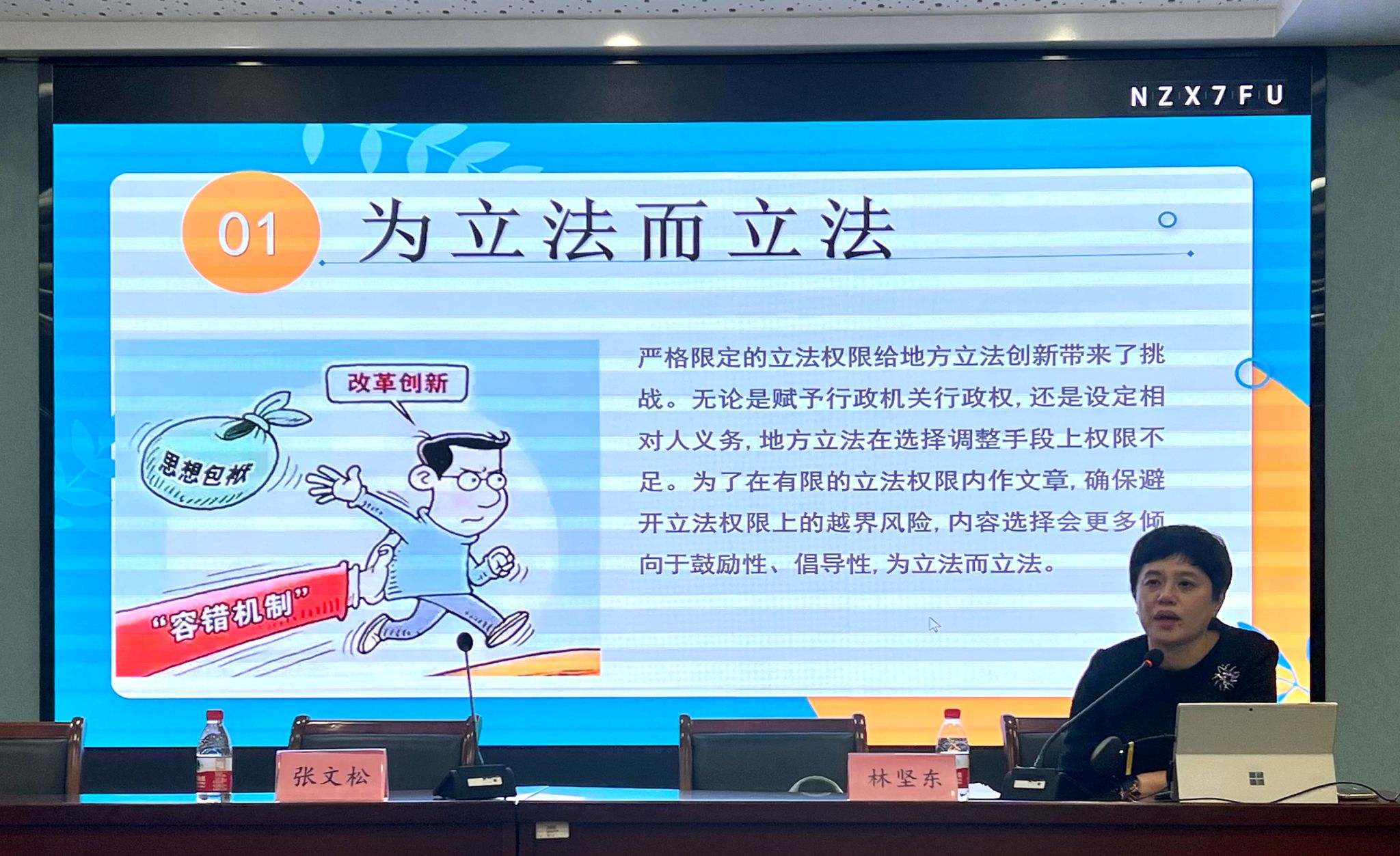 接着,林处长从为立法而立法、照搬照抄严重、重复立法较多和把确定职责、权益当成主要内容这四个维度与同学们共同分析宁波行政立法如今面临的困境。严格限定的立法权限以及上位法的限制给地方立法创新带来了挑战,为了避开立法权限上的越界风险,立法内容多倾向于鼓励性、倡导性,仅提出基本的原则,不对具体调整手段作出明确规定,致使整个制度成为“景观式立法”。为此,林处长就如何改进地方立法提出了“三精”立法理念和标准,即精准选题、精良设计、精炼表达。地方立法要体现地方特色,也要为改革保驾护航,凸显立法符合实际问题的客观性、立法调整的适合性、现有立法的空白性以及本级立法的有权性四个要件。