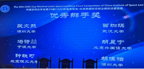 这是我第一次参加模拟法庭比赛,非常感谢各位学长学姐的支持与帮助。在这一过程中我学习到了很多。本次赛题涉及黑暗与宁静天空、近低空轨道卫星、空间碎片减缓准则等一系列国际空间法的热点。这次比赛中,我既收获了宝贵的模拟法庭参赛经验,又收获了宝贵的友谊。祝愿宁大moot越办越好(冯诗喆)。