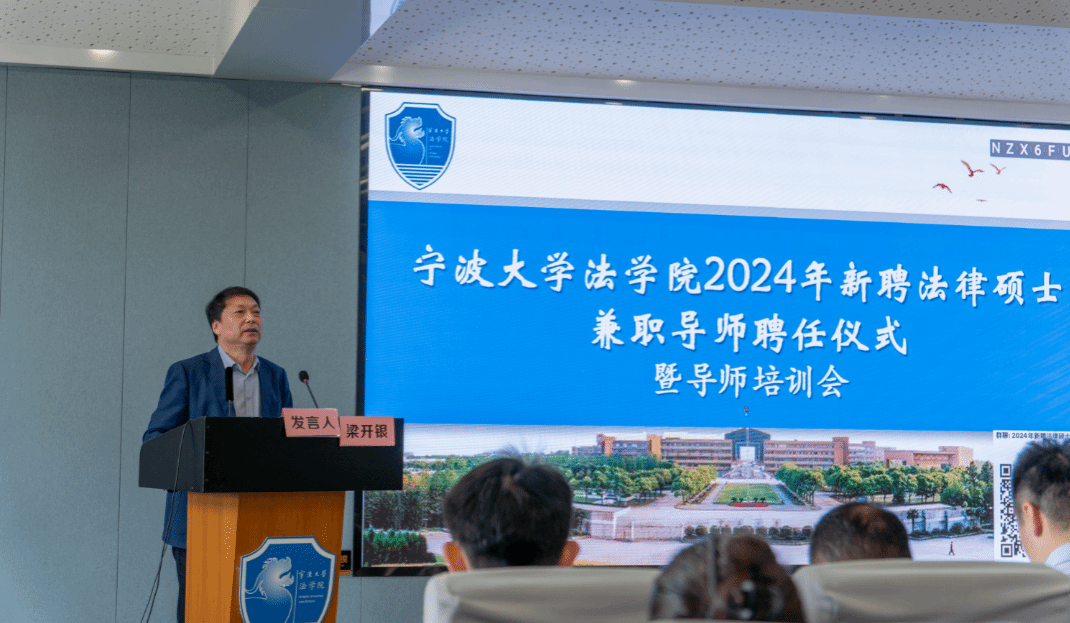 院长梁开银教授、副院长何跃军教授、法律硕士教育中心常务副主任乔宜梦副教授、副主任张文松博士出席此次会议。来自宁波市中级人民法院、宁波市检察院、舟山市检察院、台州黄岩区人民法院、宁波鄞州区人民法院、宁波市仲裁委、中共宁波市委党校、宁波市疾控中心、宁波中浦投资控股集团有限公司、北京盈科(宁波)律师事务所、北京德恒(宁波)律师事务所、北京大成(宁波)律师事务所、北京康达(宁波)律师事务所、上海汉盛(宁波)律师事务所、浙江导司律师事务所、浙江合创律师事务所、浙江京衡(宁波)律师事务所、浙江海泰(奉化)律师事务所、浙江六和(宁波)律师事务所、浙江纽华律师事务所、浙江元甬律师事务所等20余家单位的37名新聘法律硕士兼职导师参加了聘任仪式。兼职导师聘任仪式由乔宜梦副教授主持。