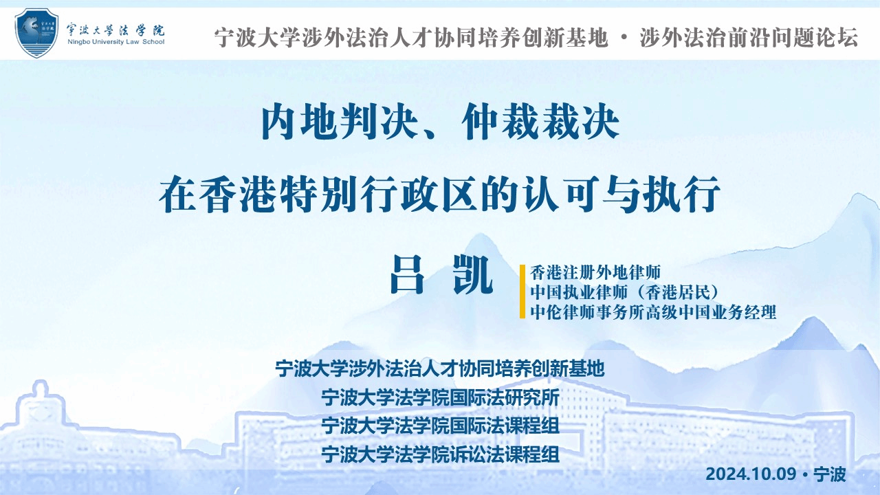 10月9日晚,由国际法课程组和诉讼法课程组合力推动的浙东法学讲坛第四十八讲暨涉外法治前沿系列(三)“内地判决、仲裁裁决在香港特别行政区的认可与执行”讲座在蓝鲸直播