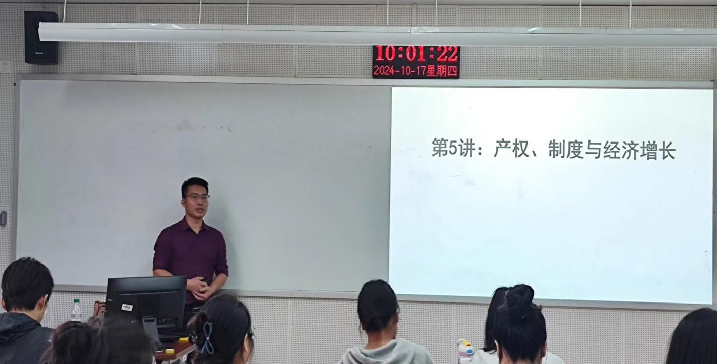公共管理系主任阳晓伟老师授课,课程为《新制度经济学》,主讲内容是“产权、制度与经济增长”。课堂围绕产权的内涵、制度的功能、中国制度的发展与经济的成功等内容展开,通过趣味小视频、现实数据对比来引申出产权的内涵,通过浅显易懂的案例、比喻,引导同学们正确理解产权、制度的功能,将思政教育很好地融入课堂教学中,学生课后对此积极反应。课堂上同学积极发言,阳老师对相关数据、案例进行了精彩的分析,结合案例开展了深刻的思政教育,课堂气氛活跃,师生互动充分。