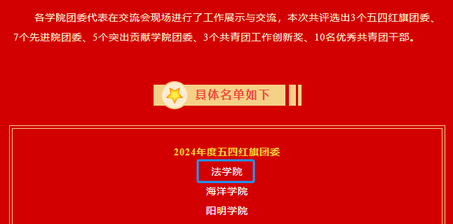 团委在过去三年中连续获评“先进院团委”,《“三维”协同,构建“卓越法治人才”实践育人模式》项目获得2024年度共青团工作创新奖。共青团工作年度评比包含基础工作量化考评和工作述职两部分,经过综合评定,蓝鲸直播
