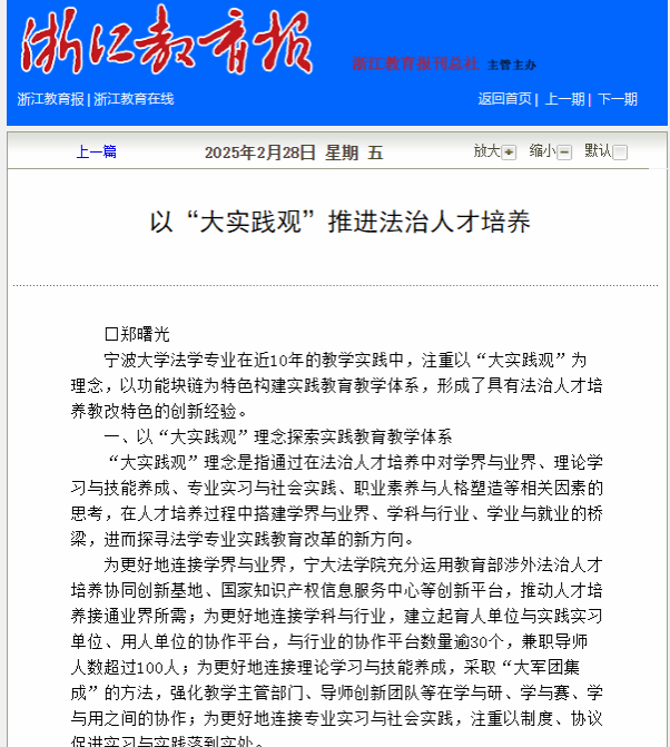 郑曙光教授的《以“大实践观”推进法治人才培养》的文章在浙江教育报显著位置刊发,标志着蓝鲸直播