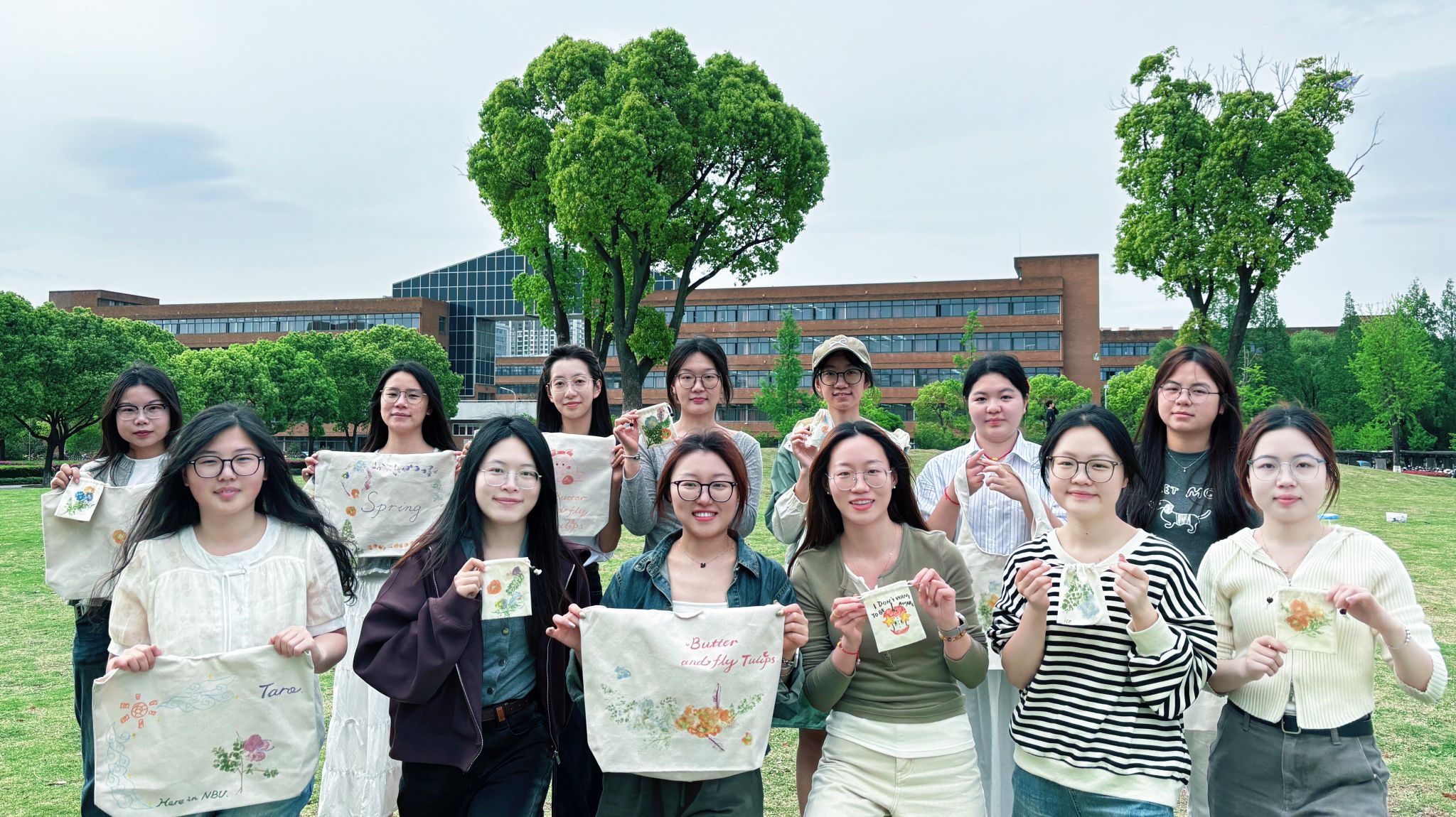 “植物拓染不仅是手作体验,更是一场正念练习”。通过亲近自然、专注创作,同学们放缓节奏,在春日的生机中重新获得内心的能量。午后暖阳裹着青草香漫过草坪,拓染的“宁大限定浪漫”在帆布包上绽放。活动结束时,同学们与自己的作品合照,春风掀起布角,仿佛放飞了一纸写给春天的情书。这一刻,自然不是风景,而是可触碰、可对话、可共生的疗愈伙伴。