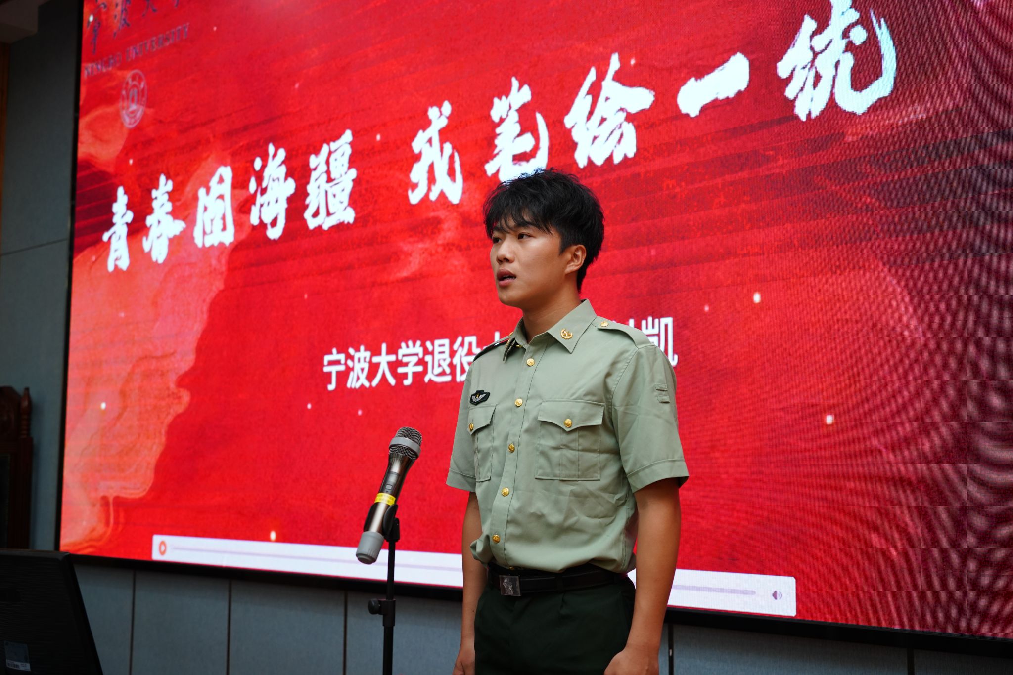 “付凯!”“到!”一声响亮的应答,瞬间将现场氛围拉满。2023级退伍军人本科生付凯率先登场,用一段刻骨铭心的军旅记忆,为新生们上了一堂生动的国防教育课。他回忆道,曾接到指令“敌机将在三十分钟内到达,立即构筑单兵掩体”,当时自己毫不犹豫抱起工兵铲冲进泥地,雨水和汗水顺着裤腿灌进去,挖到半人身高时,清晰听到“咔”的一声,剧痛瞬间从手腕蹿到天灵盖。但即便如此,也没有丝毫退缩。最后,他动情地说:“青年强则国家强,青年有担当则国家有力量,如今国防的接力棒已经交到我们青年手里。”朴实的话语里满是热血,让在场新生深刻体会到责任与担当的重量。