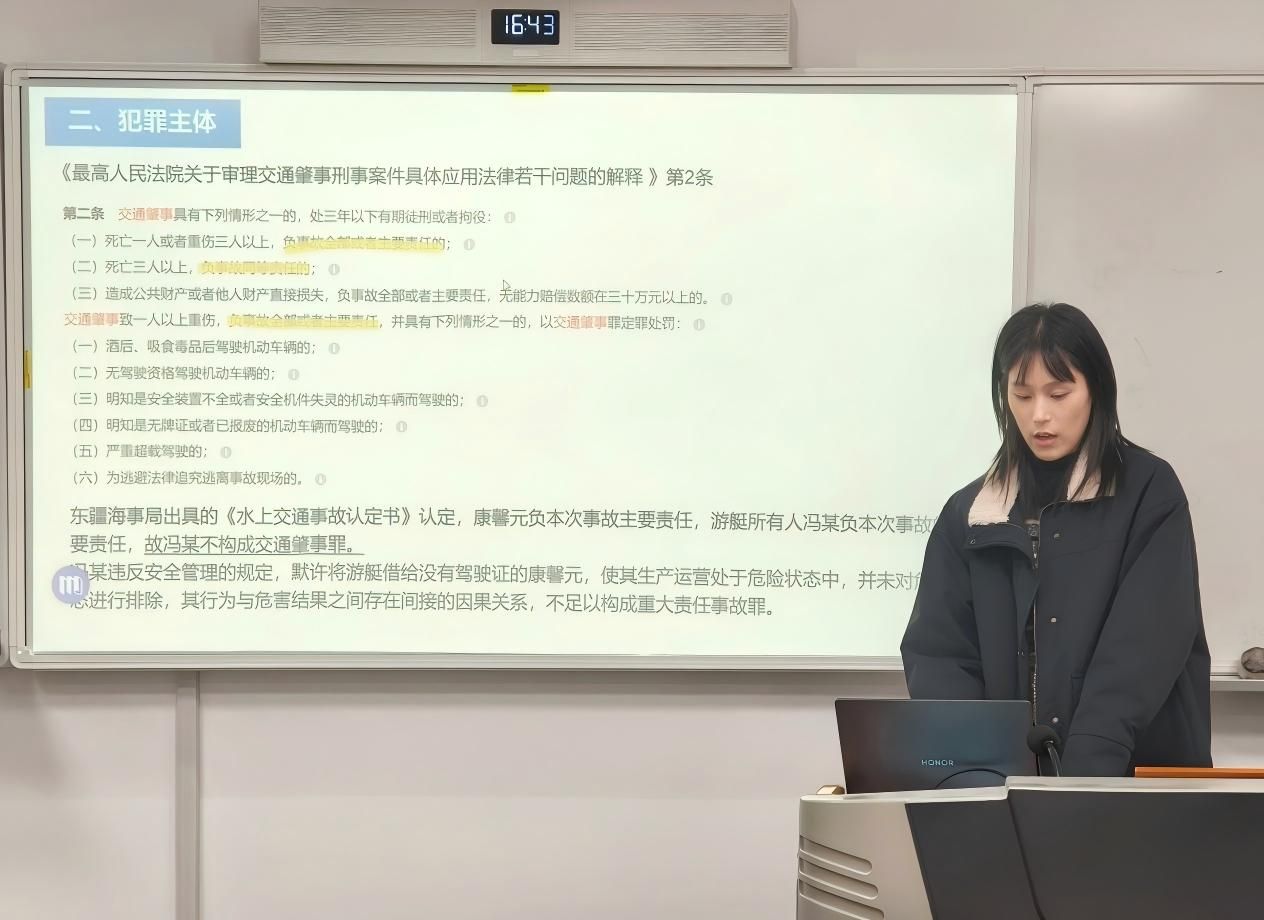 沙龙第一阶段由2024级研究生胡逸凡、金银伟、周舟分别就三起游艇肇事 的犯罪性质、因果关系和责任主体范围等问题进行具体分析,明确了“重大责任事故罪”、“重大劳动安全事故罪”与“交通肇事罪”的区分规则、总结了游艇监管体系的现存问题。