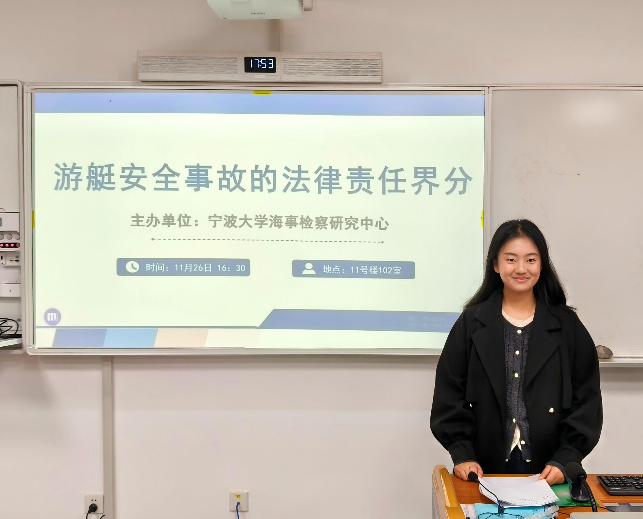 第三阶段由陈海波与赵微老师作点评发言。陈老师指出:游艇作为当今社会的新型交通工具,研究存在许多空白。此次沙龙兼具理论与实践意义,是学科交叉融合研究的良好开端。赵微老师认为:“十五五”规划提出“旅游强国”和“体育强国”的建议,游艇娱乐项目融合了旅游和体育两项强国事业,必将成为未来的朝阳产业。目前国家对游艇的安全管理和法律规制尚处于探索阶段,学生们应当以“立体化”的多维视角全方位考虑游艇的法律问题。