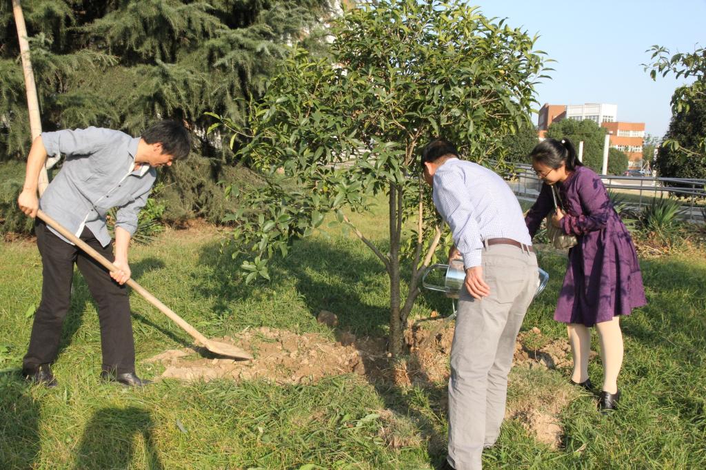 教学楼后,栽种了5棵桂花树,并合影留念。