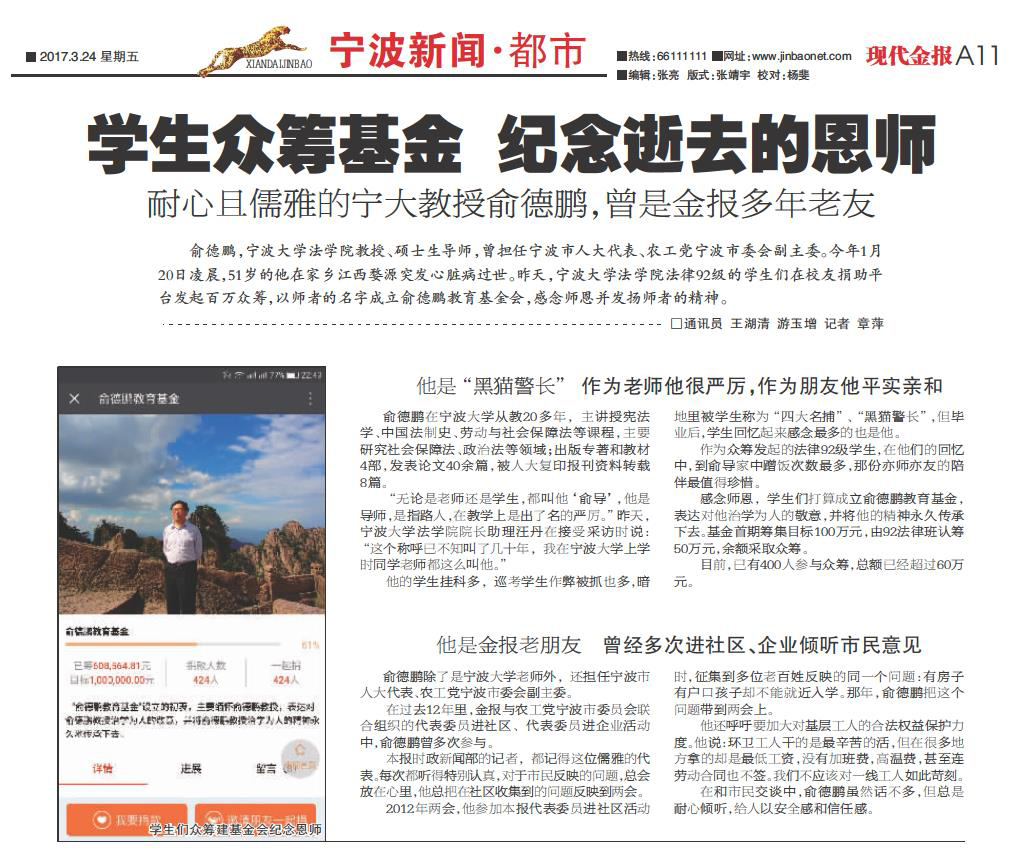 【现代金报】学生众筹基金 纪念逝去的恩师
