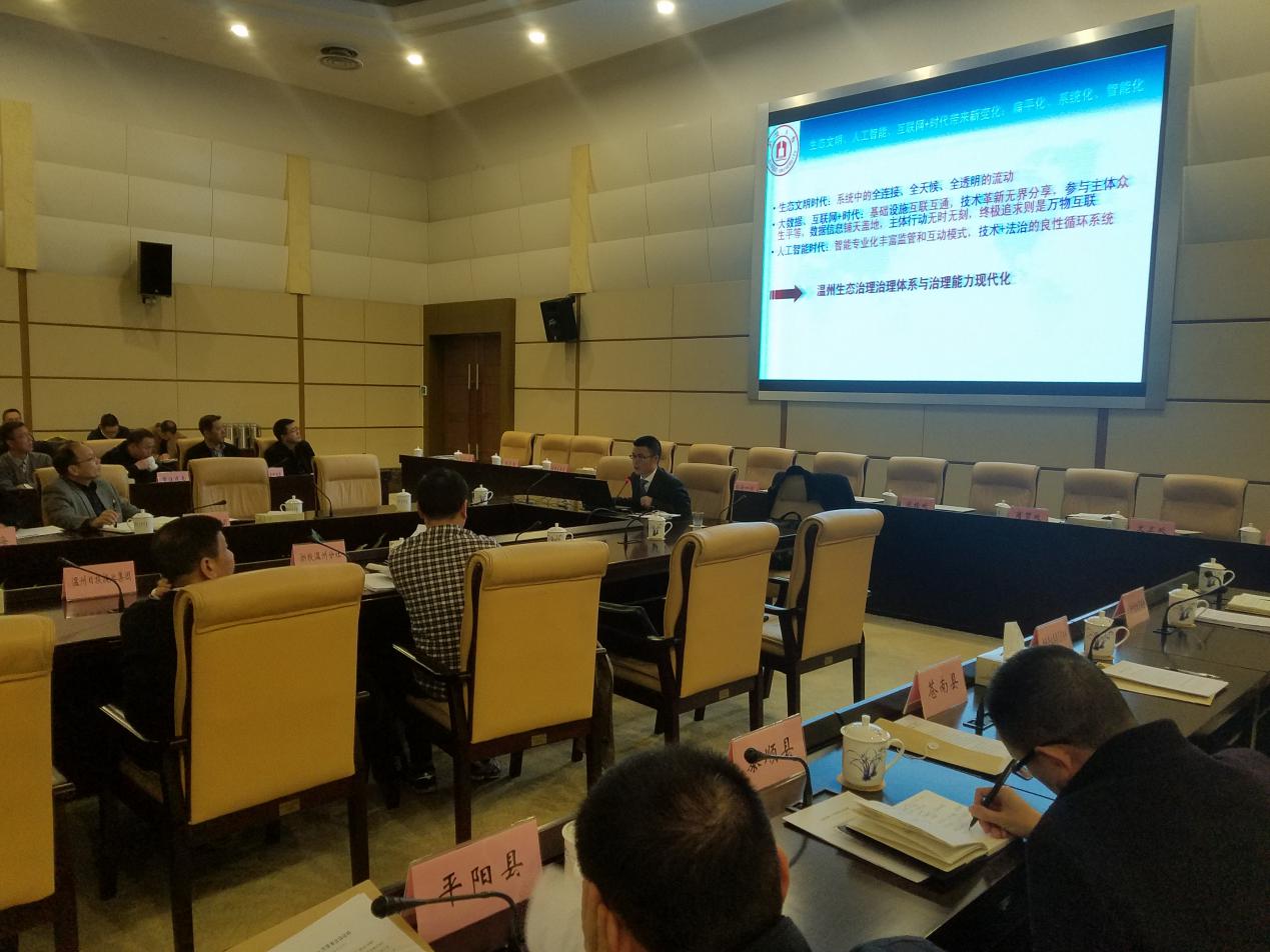 钭晓东教授以《风险社会中政府环境责任风险及法律防范》为题进行了讲解。钭教授从风险社会对政府环境治理提出的新挑战、生态文明与绿色发展对政府环境责任提出的新要求、新时势下政府环境治理所面临的三层次环境责任风险、政府环境法治推进中的四层次环境行政能力夯实、地方生态法治能力现代化的五大要点等五个方面,详细讲解了政府环境责任的相关政策法规与系列法律问题;并对新常态下环境法治的走向,尤其是生态文明、人工智能、互联网+时代带来新变化(扁平化、系统化、智能化)的转型背景下,进行系统针对性的分析,再推进绿色发展、深化政府环境责任、健全法律法规及制度、生态文明转型期的温州环境经济双赢型城市建设及突破点选择等层面提出系列针对性的建议。