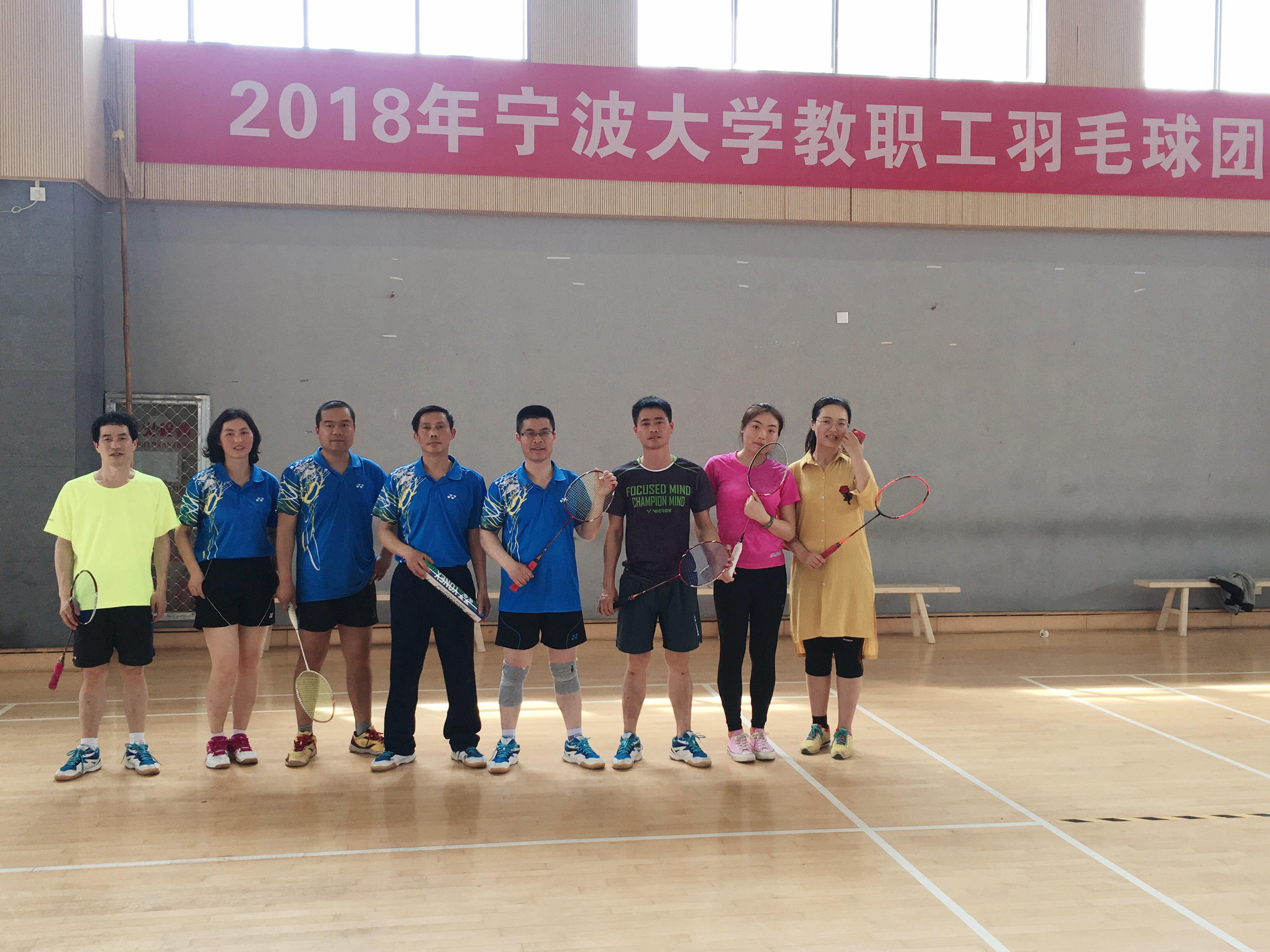 教工羽毛球队由刘满达、钭晓东、郭占红、罗维、曾江波、魏丽、吴敏、阳晓伟、邓美玲九位老师组成。