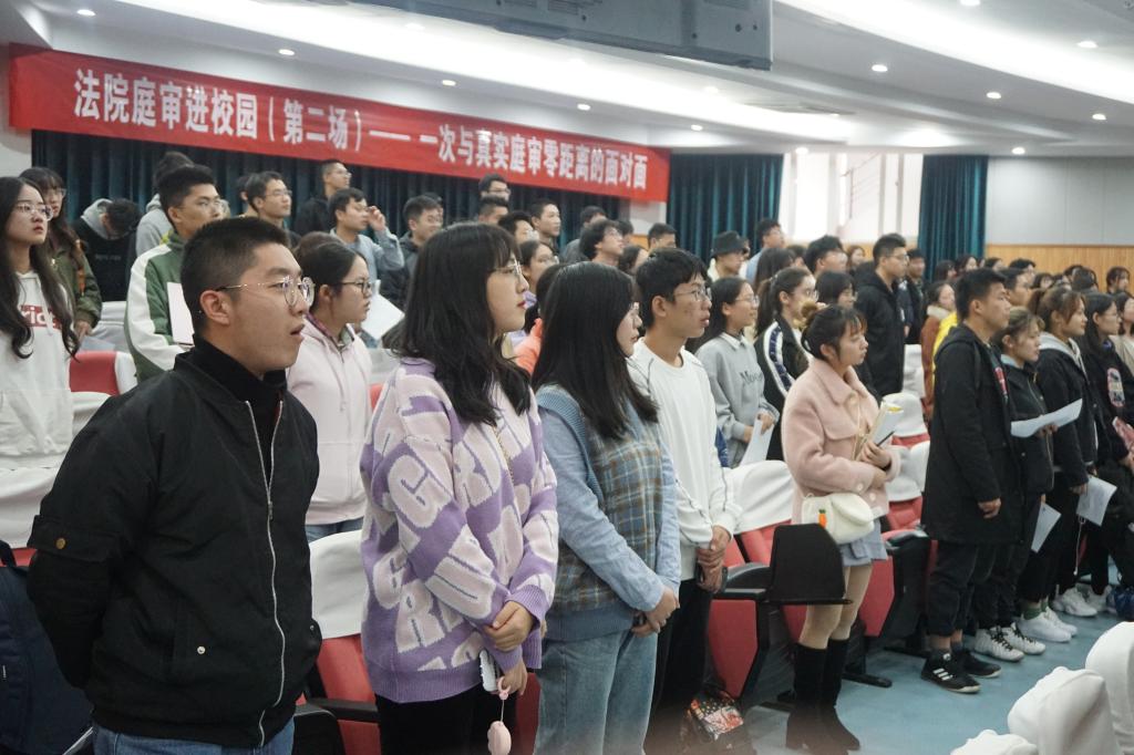 下午两点,伴随着书记员宣读法庭注意事项的声音,庄严的庭审开始了。“法院庭审进校园”第二场正式开庭,一场关于劳动合同赔偿金纠纷的案件在此审理,共200余名师生观摩了本次案件审理的过程,接受了一堂鲜活而深刻的法治教育课。
