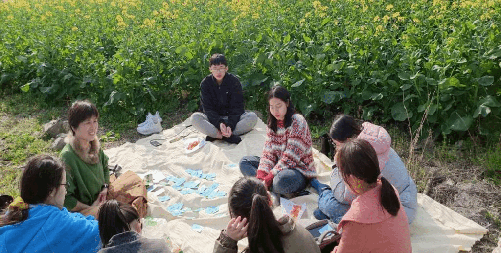 春暖花开,草长莺飞。“悦读”沙龙成立后的首次活动在宁大校园“油菜花”观景园里开展,本次“悦读”沙龙的内容是通过玩NVC倾听卡牌中的“找需要”的游戏来进行自我探索并结合大三的规划来分享各自的心得。轮到封老师分享,她选择了“信任”的需要卡牌分享了故事后总结说:“我教学时间也不短了,但从未与学生内心如此贴近过,别人都诧异我为什么要做这样一件费时又不显力的事情,我清晰而笃定的信任生命自身的力量,感谢你们的信任让我乐此不疲地走在这条共同成长的路上……”。活动结束后,师生又一起精心布置了读书场地,购买了共读书籍,准备了后期活动所需的鲜花、茶点,并用合影记录互相陪伴共同成长的温馨岁月……