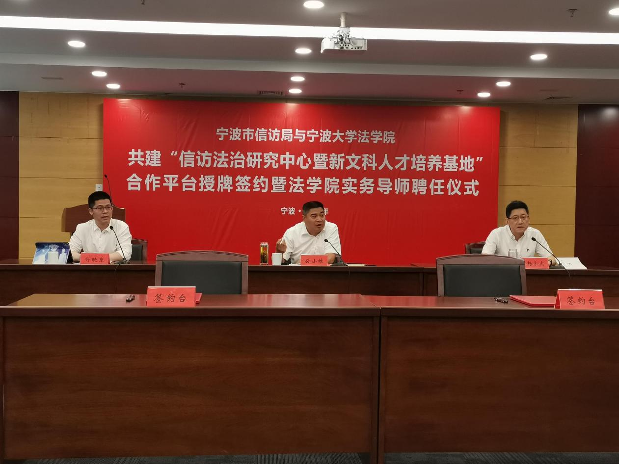与宁波市信访局共同举行双方共建的“信访法治研究中心暨新文科人才培养基地”合作平台签约揭牌仪式。由市信访局信访督查专员杨永宗主持。市委副秘书长、信访局局长孙小雄,市信访局办公室、综合指导处、办信处、接访处、督查处、复查复核处等处室处长、蓝鲸直播