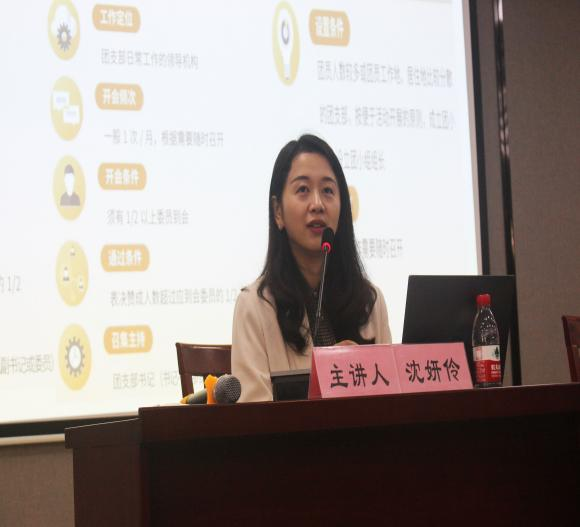 和数学与统计学院在包玉书9号楼113联合举办主题团校。校团委副书记沈妍伶老师以“加强基层团组织建设”为主题,为2个学院的60多名团学干部及学生组织干部进行授课。