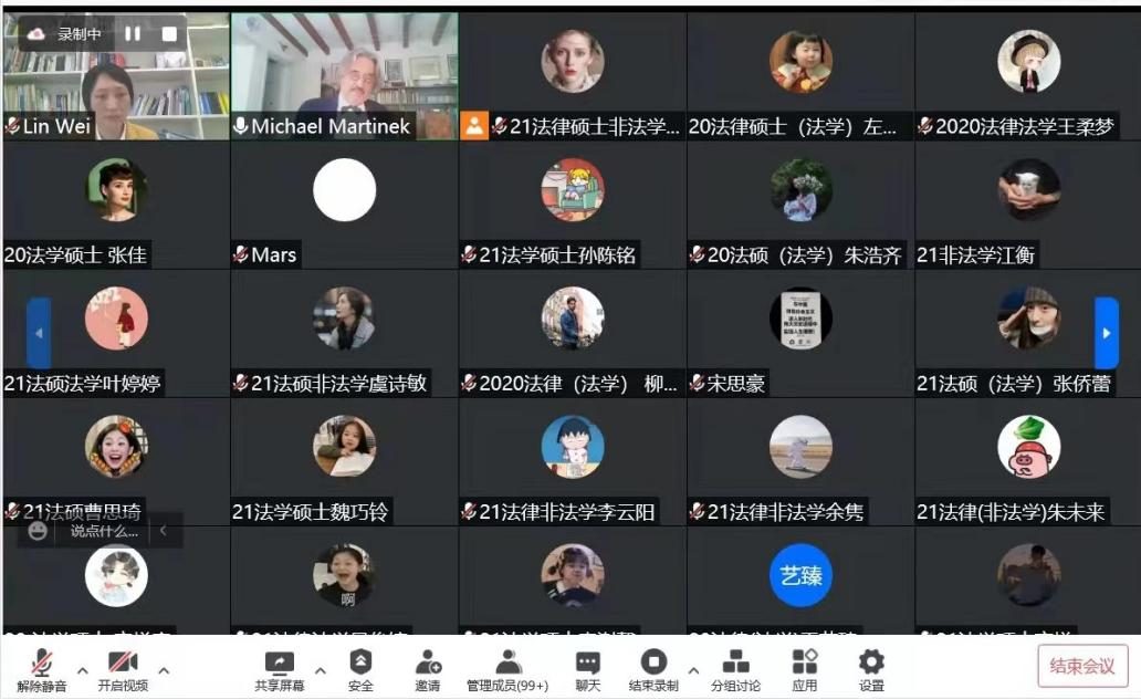 有百余名师生在线参与。马丁内克教授介绍国际商事仲裁的基本问题和国际商事仲裁的法律框架,重点分析了国际商事仲裁的优势、国际商事仲裁特有的程序以及国际商事仲裁程序中的特别问题。