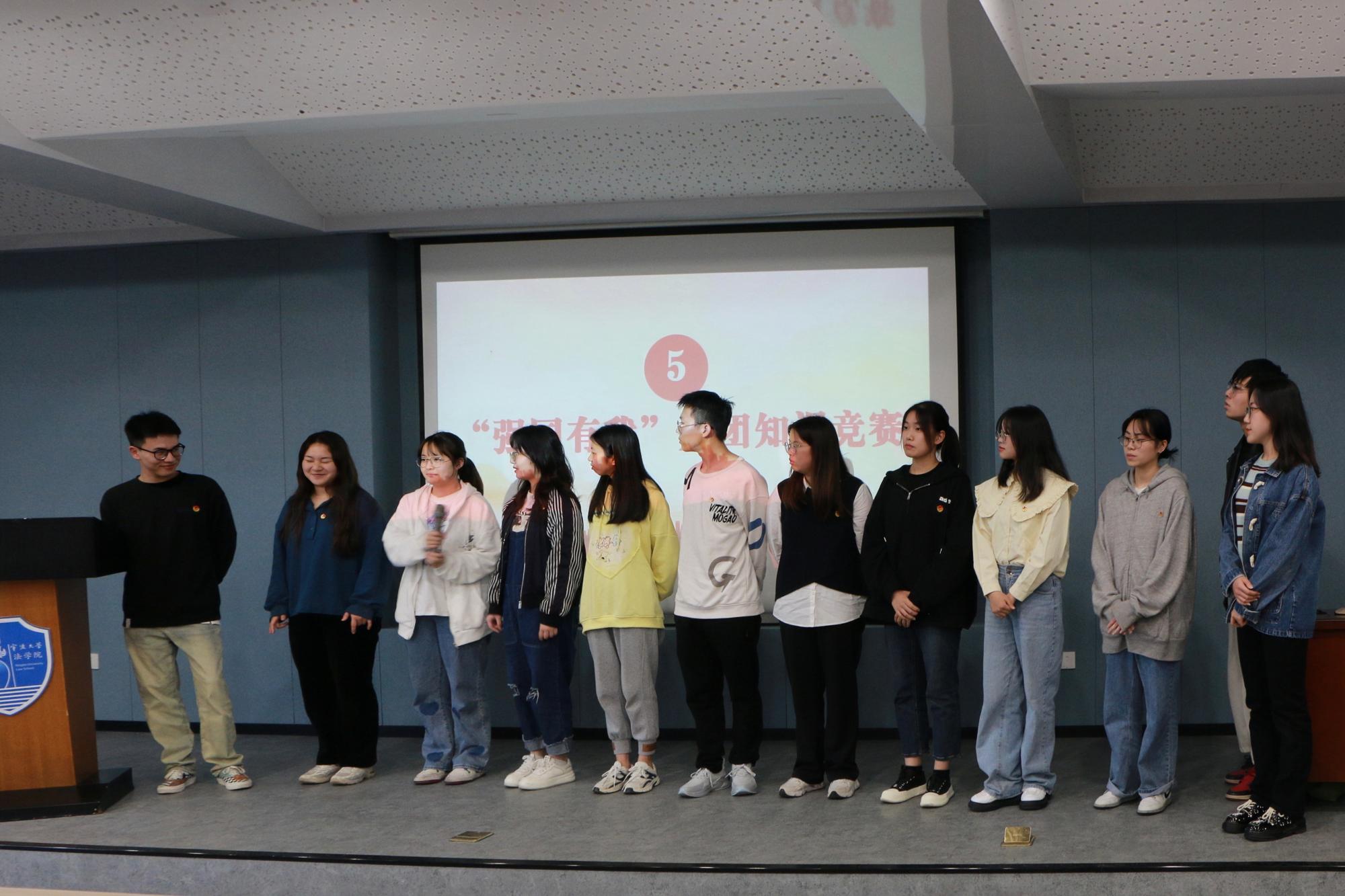 第四项议程为“强国有我”党团知识竞赛。该竞赛由各团小组派出一位同学参加,主持人从卡尔马克思杯竞赛试题库中抽取试题提问,赛制采取一站到底的模式,只有最后三位留在台上的同学才能获得荣誉和奖品。最终排名前三的是法学四班第五团小组、法学四班第六团小组和法学四班第七团小组。