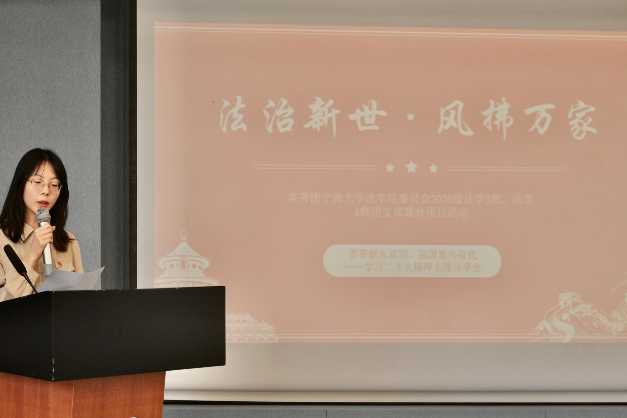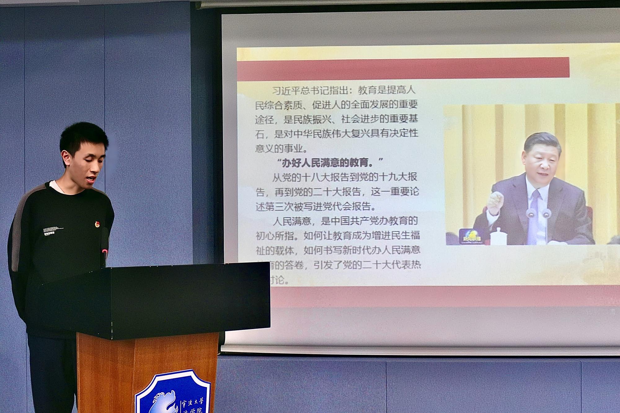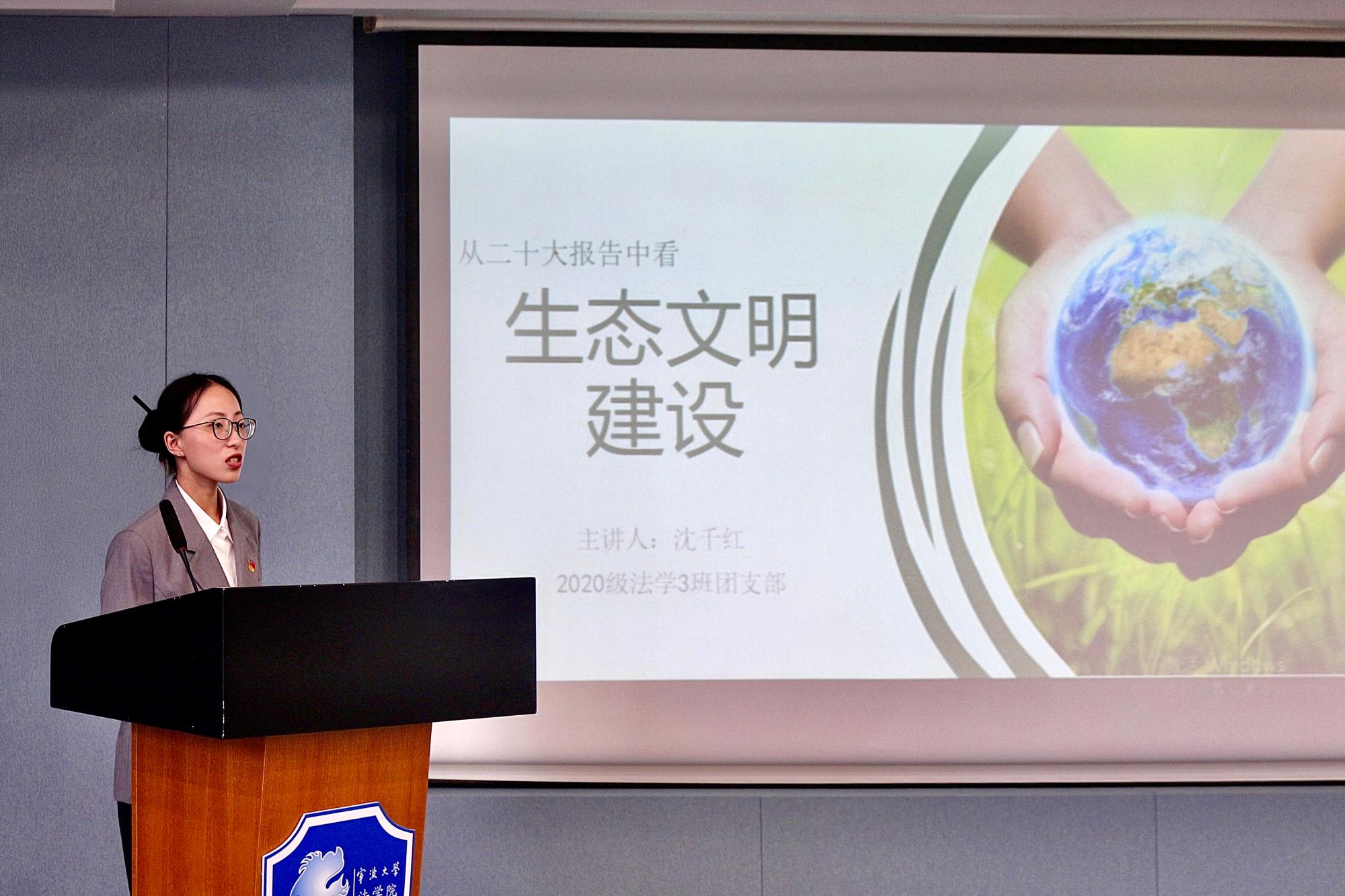 其中,第一位主讲人黄恬钰同学,带来《法治新世,风拂万家》演讲,作为一名法学生,她将自己的所思所感与国家的法治理念相结合,使同学们认识到法治社会、法治政府的意义。第二位主讲人朱俊蓉,带来《感恩于水鉴于行》演讲,以《道德经》中的水为论证基石,出身宁波的船王包玉刚作为示范,表达了青年作为国家未来的希望,要像一滴水一样融入江河,贡献自己的力量,紧密结合了青年强则国强的时代命题。第三位主讲人沈千红,带来《从二十大报告中看生态文明建设》微课,介绍了现代化新征程下的生态建设,同时呼吁我们青年也应提高生态环境意识,共同构建绿色家园。最后一位主讲人孙梓铭,带来《扎根深山,点燃希望》微课,他介绍了党的二十大代表张玉滚先生,这位汗洒山乡无怨无悔的伟大共产党员,强调了教育的重要性,激励我们学习模范,无私奉献。