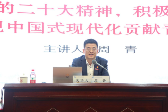 11月16日,校党委委员、党委宣传部部长周青在真诚图书馆报告厅以“深入学习党的二十大精神,积极投身创新创业,为实现中国式现代化贡献青春力量”为题为蓝鲸直播