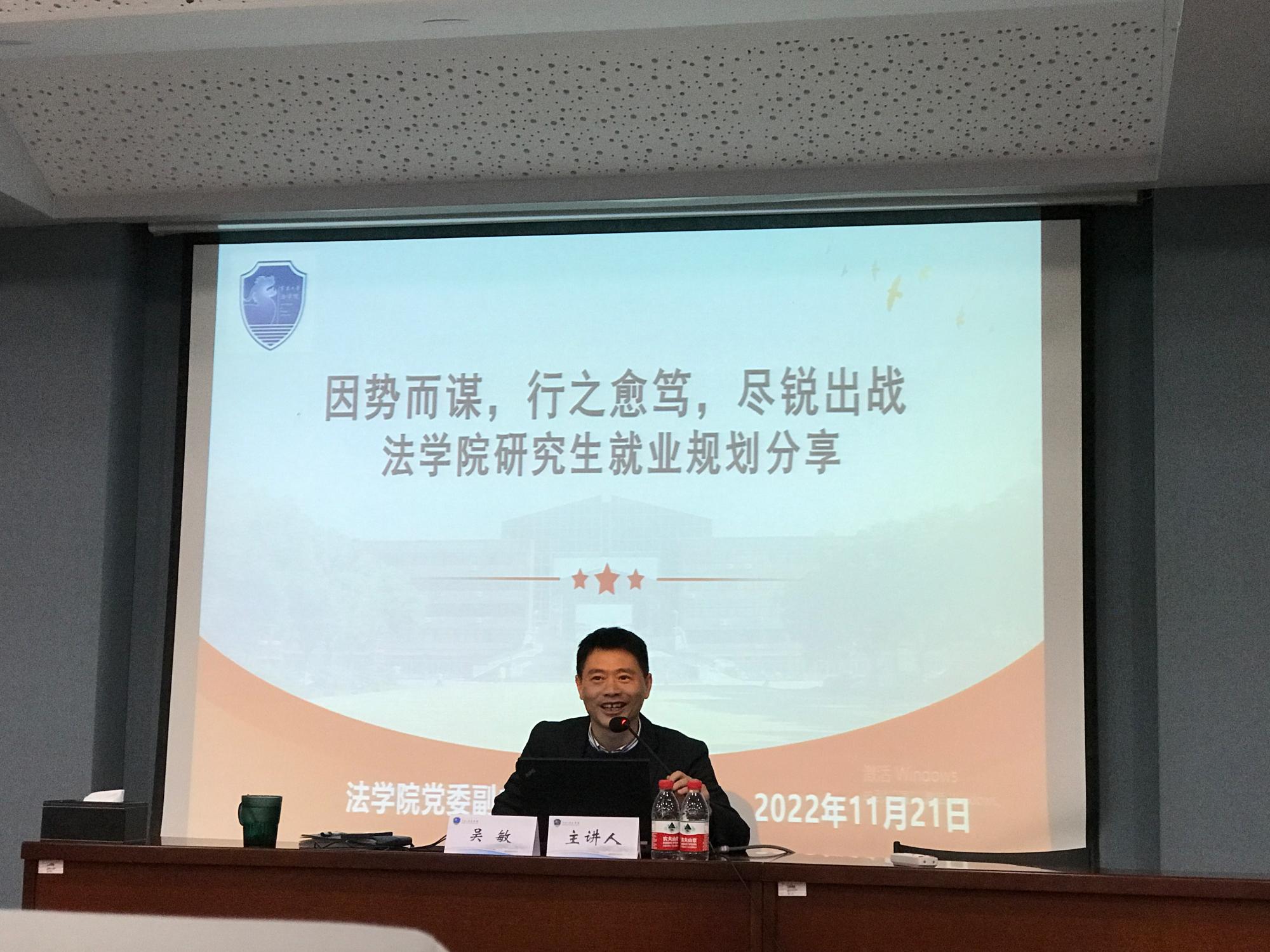 吴敏老师长期坚守在学生工作一线,有着丰富的学生职业规划和就业帮扶经验。围绕法科学生的职业路径方向、如何选择合适自己的职业、强化法科学子就业能力的准备三个方面,结合数据和案例,吴敏老师带领大家一起走进了法科研究生的之路,引导大家树立正确的就业观念。