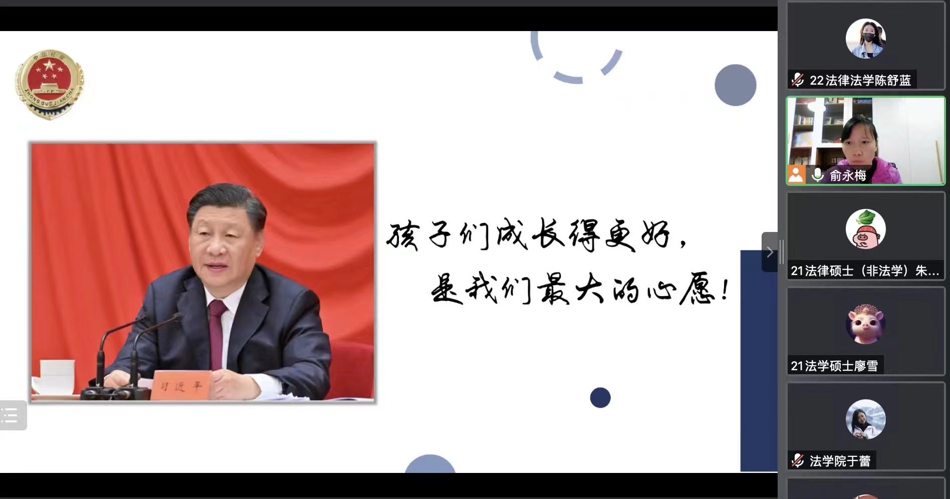 本次线上讲座圆满结束,俞主任向大家表达了“孩子们成长得更好,是我们最大的心愿”的真切愿望,并对所有参会成员表示感谢。整场讲座内容丰富,为在场师生带来了一场精彩的学术盛宴,引发了大家度对未成年人制度的充分讨论与思考。