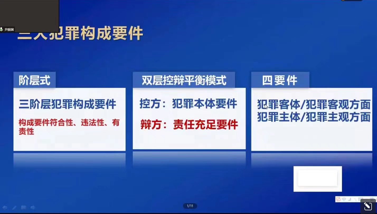 1月4日晚,研究生法治实务课程系列讲座《从出罪的视野看三大犯罪构成要件》在线上会议顺利举行。讲座由浙江省宁波市中级人民法院四级高级法官尹振国主讲,由蓝鲸直播