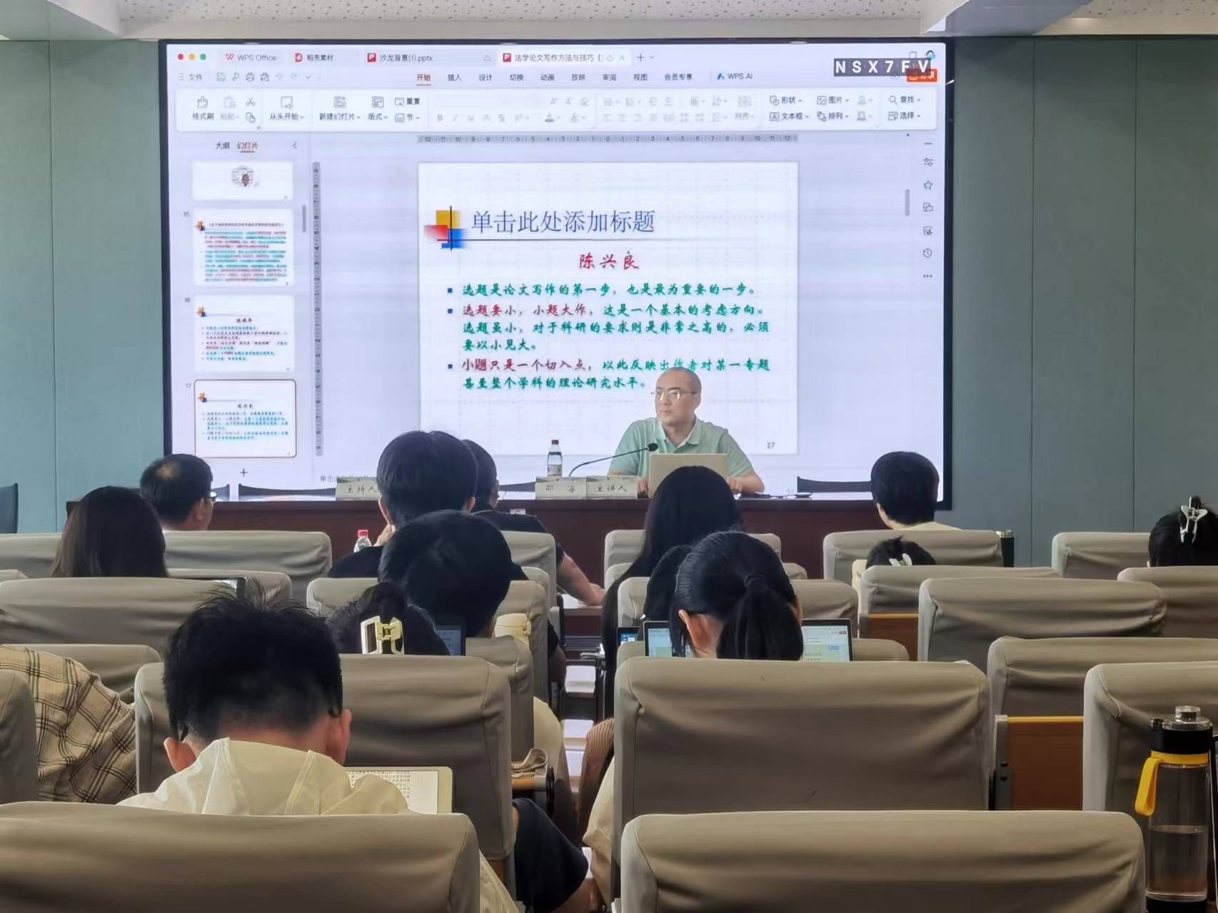 邵主任首先强调了选题的重要性,指出论文应始于一个明确且具有研究价值的问题,而不仅仅是对现象的简单描述。他倡导从生活中提炼问题,逐步升级至学术问题,法学问题乃至部门法的特定问题,强调了学术研究应当具有问题意识,特别是关注“中国问题”,呼应了中共中央和国务院办公厅提出的加强新时代法学教育和法学理论研究意见的要求,扎根中华文化,解决中国问题,避免单纯搬运西方理论,倡导构建具有主体性、原创性和标识性的中国自主的法律知识体系。
