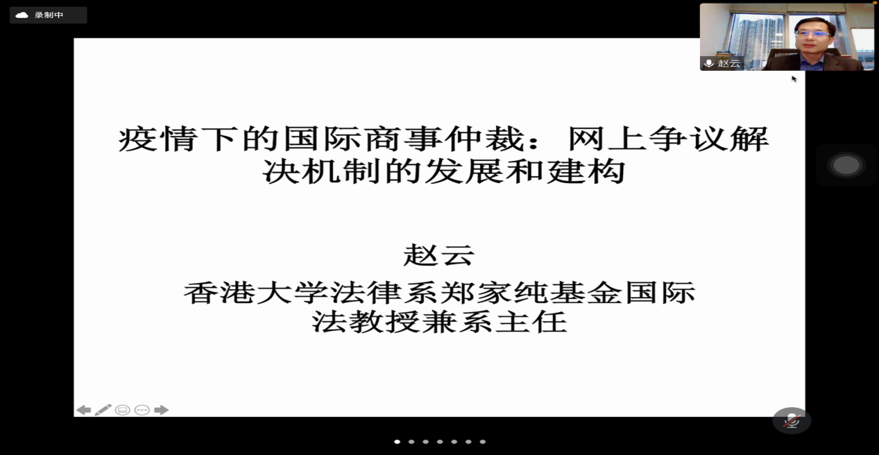 讲座伊始,赵云教授结合当前疫情局势下线下开庭难题,引出了国际商事仲裁网上争议解决机制的重要性。接着赵云教授介绍了网上争议解决机制采用的各种手段,如互联网平台在线服务、电子邮件、视频会议等等,作为争议解决流程的一部分,来解决网上或线下发生的争议纠纷。