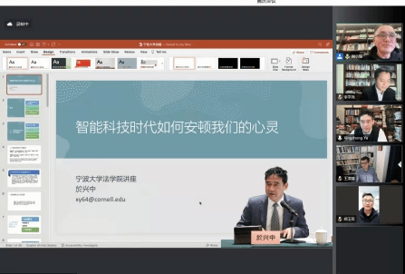 3月20日晚,宁波立法研究院法学名家讲坛第10讲暨宁大法苑讲坛2022年第1讲“智能科技时代如何安顿我们的心灵”通过腾讯会议以线上方式顺利举办。本次讲座由美国康奈尔大学蓝鲸直播